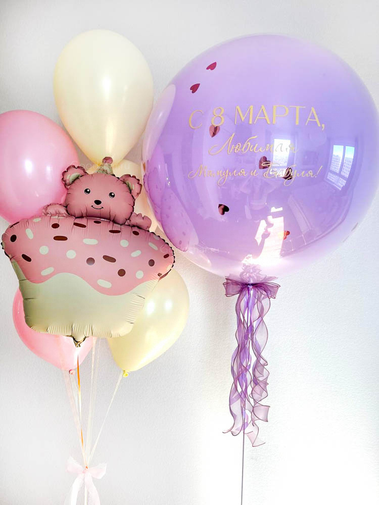 Трогательная композиция со стеклянным шаром с наполнением и индивидуальной надписью, дополненная фольгированным шаром с медвежонком и латексными шарами. Отличный вариант для душевного поздравления.