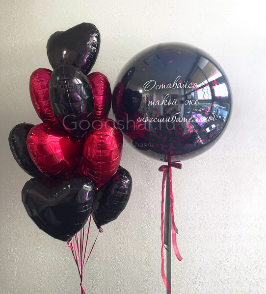 Смелый и эффектный набор для настоящей роковой женщины. В центре внимания — стеклянный шар-гигант чёрного цвета с индивидуальной надписью и наполнением, который становится главным посланием и хранителем самых важных слов. Объёмный фонтан из 12 фольгированных шаров в красных и чёрных тонах создаёт мощную энергетику, символизируя страсть, силу и характер. Идеальный выбор для дня рождения, юбилея или подарка для той, кто привык быть в центре внимания и производить неизгладимое впечатление.