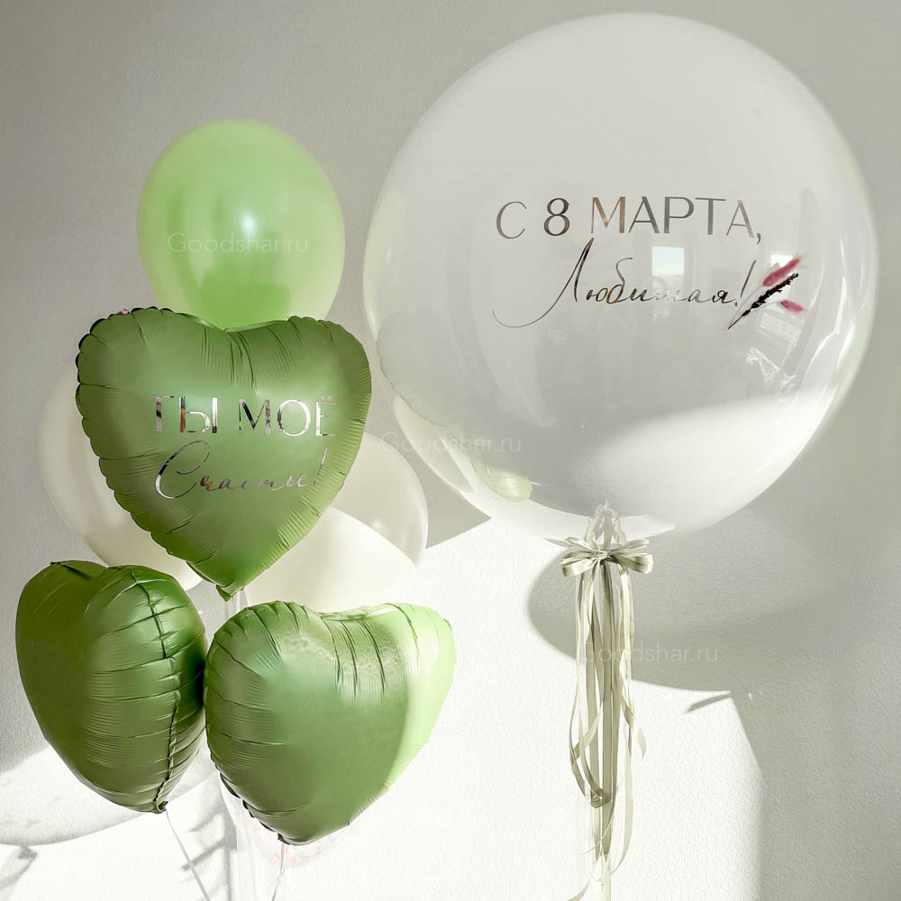 Стильная композиция со стеклянным шаром с индивидуальной надписью, дополненная фольгированными сердцами и латексными шарами. Идеально подойдёт для тёплого и душевного подарка.