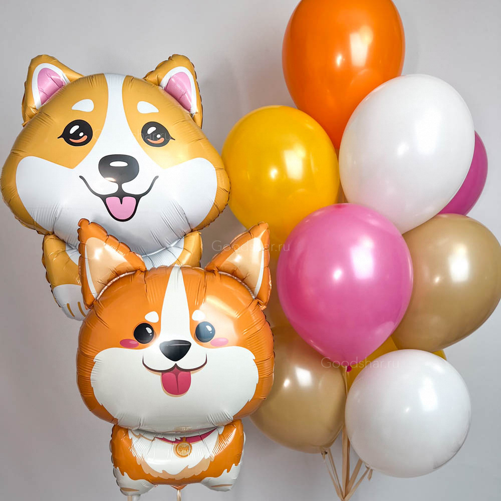 Игривая композиция с фольгированными шарами в виде корги и латексными шарами на атласных лентах. Отличный вариант для детского праздника или приятного сюрприза.
