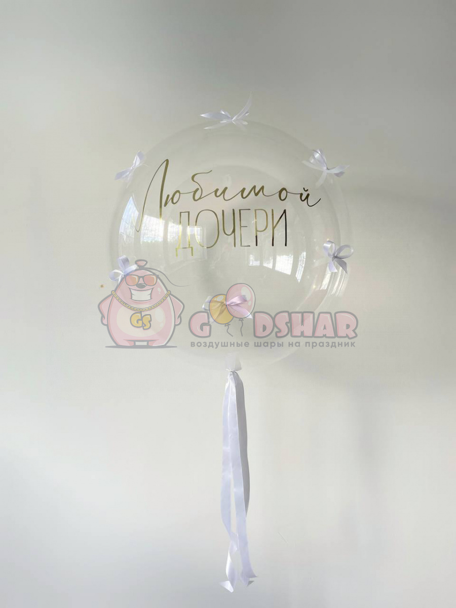 Прозрачный шар "баблс" с индивидуальной надписью и бантиками.
