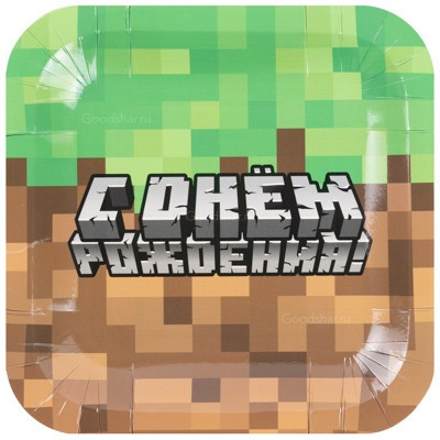 Бумажная квадратная тарелка. Содержит надпись "С ДНЁМ РОЖДЕНИЯ". Используется совместно с другими элементами коллекции Пиксели как украшение стола или по своему непосредственному назначению. В упаковке 6 тарелочек.